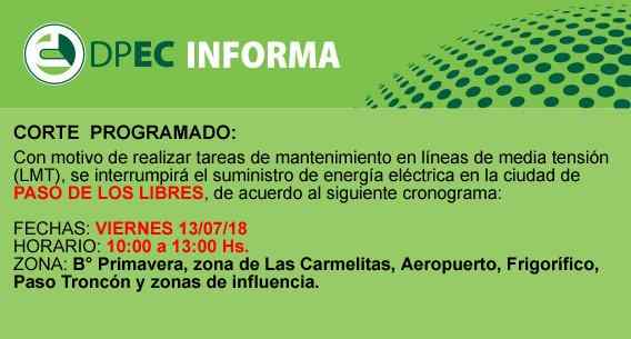 La Dirección Provincial de Energía de Corrientes informa que con motivo de realizar tareas de mantenimiento el jueves 12 en líneas de media tensión, se interrumpirá el suministro de energía eléctrica en nuestra ciudad, en el horario de 09:00 a 12:00.