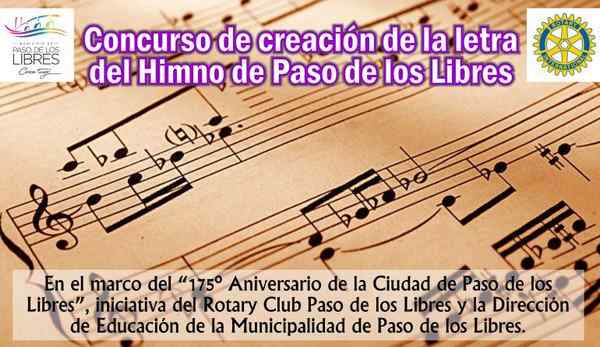 En el marco del “175º Aniversario de la Ciudad de Paso de los Libres”, el Sr. Intendente Municipal, Dr. Martín Ignacio Ascúa, a iniciativa del Rotary Club Paso de los Libres y mediante su Dirección de Educación, convoca a Concurso público para la creación de un Himno que identifique a la ciudad.