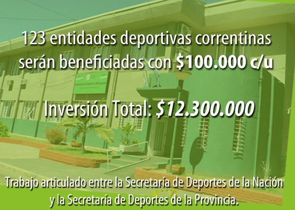 Mediante un trabajo articulado entre la Secretaría de Deportes de la Nación y la Secretaría de Deportes de la Provincia, y atento a la política del Gobernador, Doctor Gustavo Valdés, de trabajar por el Deporte como “Política de Estado”, próximamente 123 instituciones deportivas de nuestro territorio, que “cumplimentaron” los requisitos del programa nacional “Clubes Argentinos”, serán beneficiadas con $ 100.000 C/u.