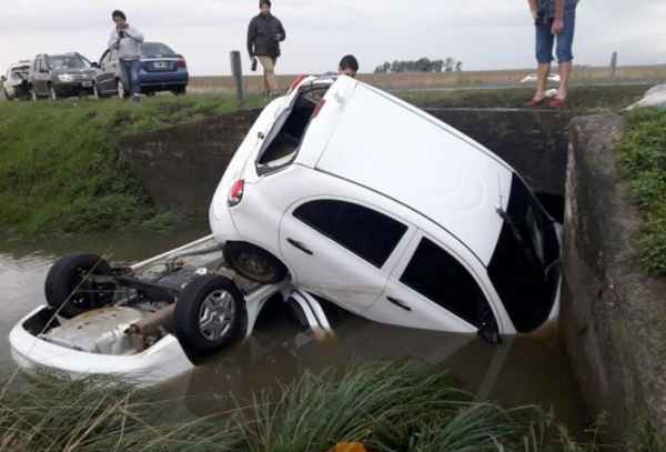 Dos automóviles patinaron por la ruta mojada y cayeron a un arroyo