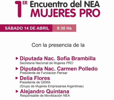 El próximo sábado 14 de abril, en la ciudad de Virasoro se estará reuniendo el equipo de voluntarias del partido del presidente donde participaran mujeres de las provincias de Misiones, Chaco, Formosa, Entre Ríos y Corrientes. Delia Flores, empresaria y Presidente de Gema, Grupo Empresarial Mujeres Argentinas, participará de la misma.