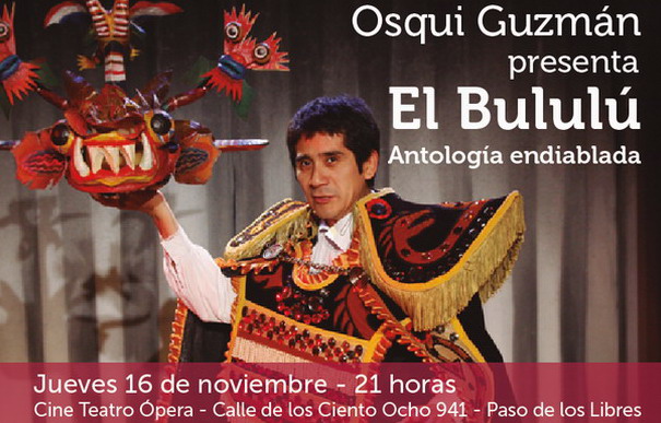 La Fundación OSDE, invita a la comunidad a la obra de teatro unipersonal "EL BULULU antologia endiablada", que se podrá apreciar el día Jueves 16 de Noviembre a las 21.00 hs en el Cine Teatro Opera, calle Los Ciento Ocho 941 de la ciudad de Paso de los Libres.