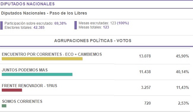 El escrutinio se conoció poco después de las 22 horas de manera oficial y allí arrojaba una victoria para Eco+Cambiemos como primera fuerza con el 45,90 % de los votos, seguidos por el frente Podemos Más con el 40,14%, fuerzas que, como en casi toda la provincia, polarizaron la elección.