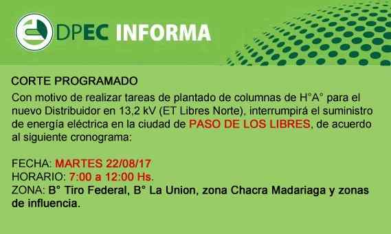 Este martes, técnicos y operarios de la Dirección Provincial de Energía de Corrientes (DPEC), llevarán a cabo tareas en infraestructura de CAPITAL Y PASO DE LOS LIBRES; por lo que se interrumpirá el servicio entre las 7.00 y 14.00. Dentro de las tareas, está previsto que se instalen postes de hormigón armado para nuevo distribuidor.