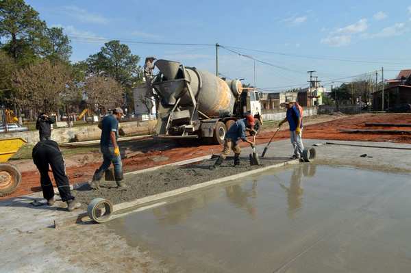 Personal municipal dependiente de la Dirección de Obras Públicas trabaja en la construcción de un playón deportivo para los alumnos del nivel primario de la Escuela Normal “Valentín Virasoro”, en el terreno ubicado sobre calle Madariaga frente a la plaza San Martín.