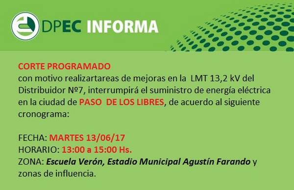 Según lo ha informado la Dirección Provincial de Energía de Corrientes, y con motivo de realizar tareas de mantenimiento en lineas de media tensión, la distribuidora interrumpirá el servicio de 13 a 15 horas.