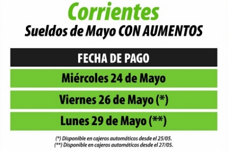 El primer tramo del sueldo de mayo se pagará el miércoles 24; el segundo se abonará el viernes 26; y el cronograma finalizará el lunes 29. Los pagos del segundo y tercer tramo estarán disponibles los días jueves 25 y sábado 27 en los cajeros habilitados por el Banco de Corrientes S.A.