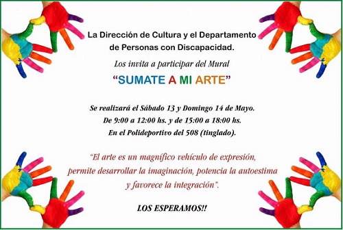 La Dirección de Cultura y el Departamento de Personas con Discapacidad invitan a la comunidad a participar del Mural “Sumate a mi Arte”. El evento se desarrollará el sábado 13 y domingo 14 de mayo, de 9 hs. a 12 hs. y de 15 hs. a 18 hs., en el Centro Deportivo del Barrio 508.