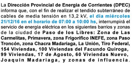 La Dirección Provincial de Energía de Corrientes, se encuentra realizando trabajos correspondientes al tendido subterráneo de cables de media tensión en un sector de la ciudad y, por otra parte, la vinculación de un nexo de 13,2 KV para alimentar una nueva subestación aérea. Por este motivo, se registran cortes durante la mañana del miércoles.