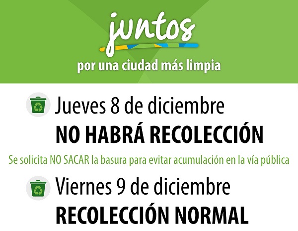 Desde la Dirección de Servicios Públicos de la Municipalidad de Paso de los Libres, se informa a la comunidad que el 8 de diciembre, Día de la “Inmaculada Concepción de María”, personal de dicha área no brindará servicio de recolección de residuos domiciliarios y patológicos, aseo urbano y barrido.