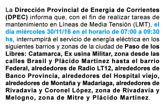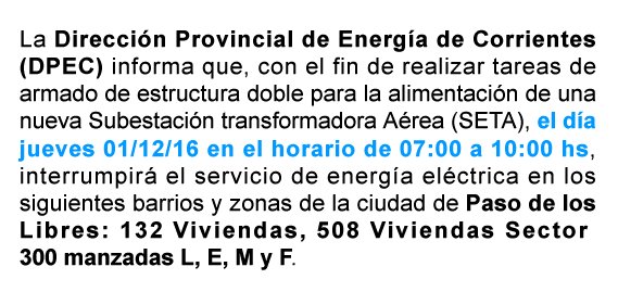 La Dirección Provincial de Energía de Corrientes, hace saber que, durante la jornada de este jueves, 1 de diciembre, y con el fin de realizar tareas de armado de estructura para nueva subestación, interrumpirá el servicio en parte del barrio 508 viviendas y 132 viviendas. Será de 7 a 10 horas.