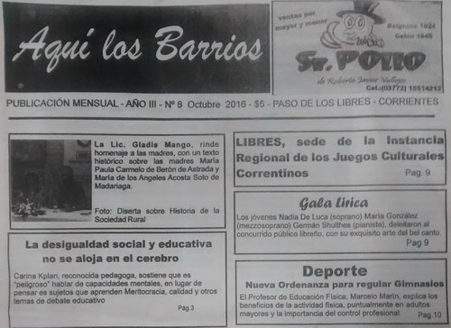 Proponemos a nuestros lectores, los temas que aparecen en la portada impresa de la publicación mensual “Aquí los Barrios”, que aborda diversos temas de interés general. Corresponde al mes de octubre y presenta temas de juventud, ciudad, sociedad y deportes.