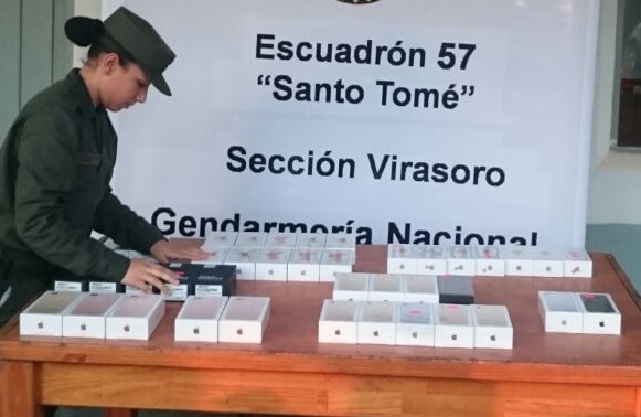 Este jueves, personal del escuadrón 57 “Santo Tomé” de Gendarmería Nacional, secuestraron en ruta 14 sobre la localidad de Virasoro, cuarenta teléfonos de marcas I Phone y Samsumg de ultima generación. El Valor de la carga incautada supera el millón de pesos y tenía como destino final la provincia de Buenos Aires.