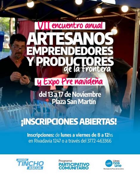 El Municipio de Paso de los Libres informa que este jueves comienza el VII Encuentro Anual de Artesanos, Emprendedores y Productores de la Frontera, junto a la Expo Pre Navideña, que se realizará del 13 al 17 de noviembre en Plaza San Martín.